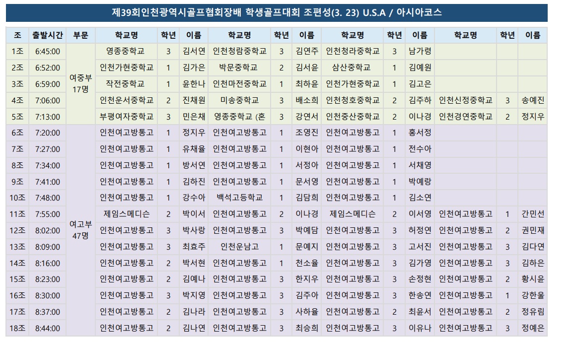 2026년 3월 23일(월) 개최되는 제39회 인천광역시골프협회장배학생골프선수권대회 1일차 경기 조편성 현황을 다음과 같이 공지합니다. 대회 관련 궁금하신 사항은 협회 홈페이지 1:1 게시판을 이용해 주시기 바랍니다.