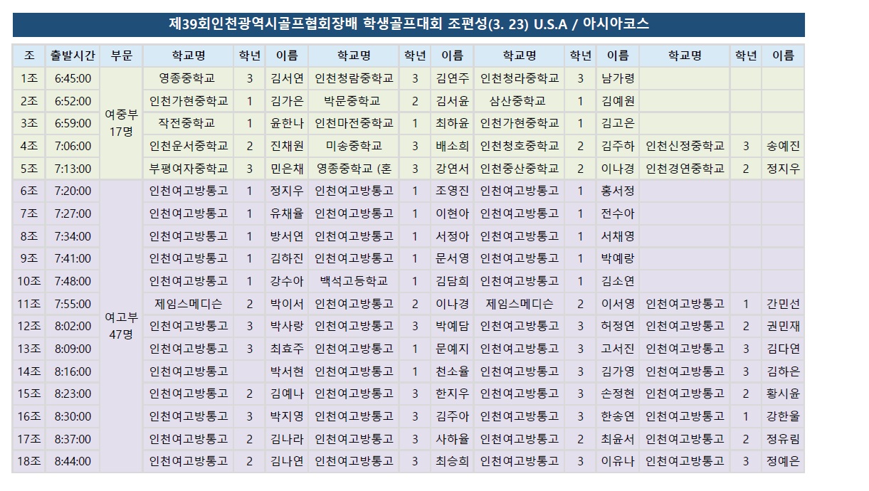 제39회 인천광역시골프협회장배 1일차(3.23) 경기 조편성 현황 안내