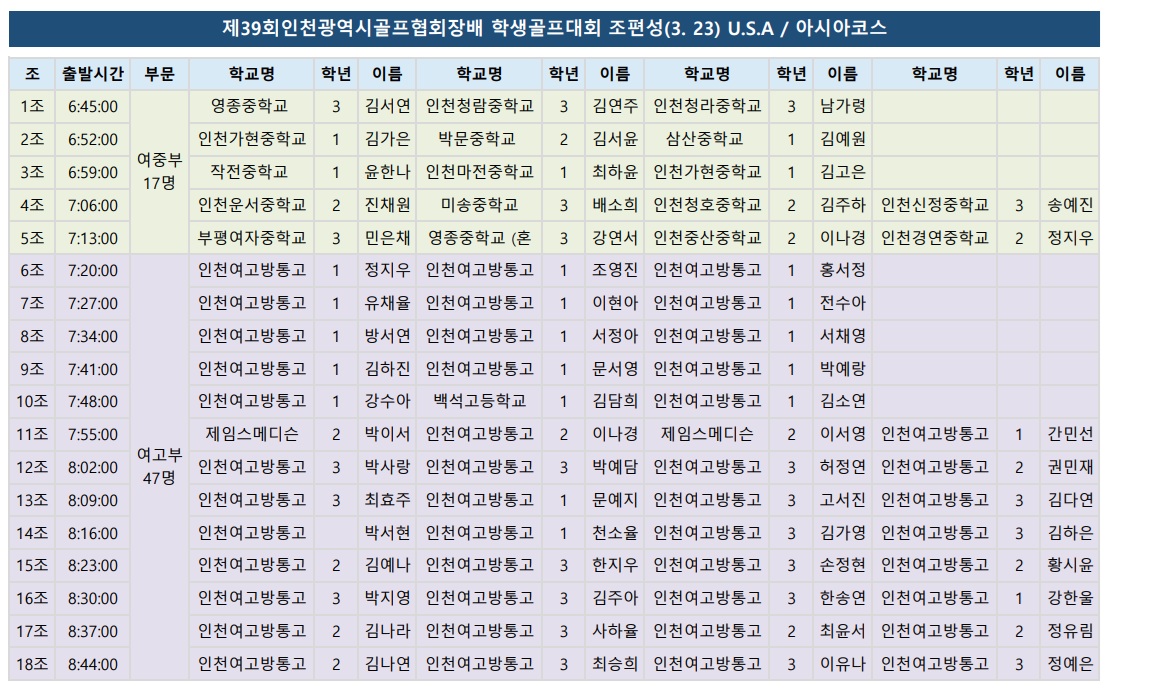 제39회 인천광역시골프협회장배 1일차(3.23) 경기 조편성 현황 안내