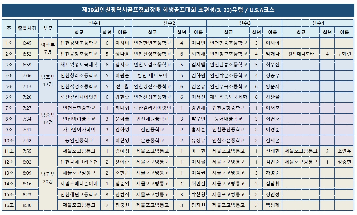 참가신청 선수의 신청 취소로 인해 제39회 인천광역시골프협회장배 학생골프선수권대회 1일차 3월 23일(월)