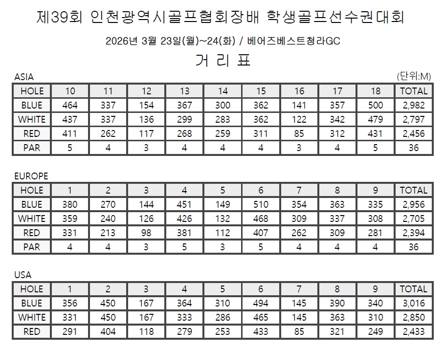 제39회 인천광역시골프협회장배 학생골프선수권대회와 관련하여 거리표를 공지하오니, 경기 운영에