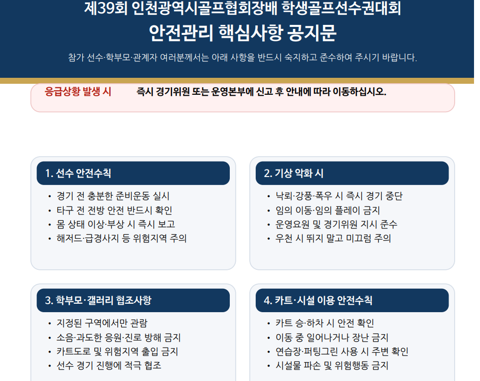제39회 인천광역시골프협회장배 학생골프선수권대회 안전관리 핵심사항 공지